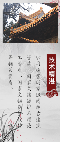 堅持質量為先,信譽為重,管理為本,服務為誠的理念。本著對社會、對建設單位負責的原則,將工程質量、安全生產放在工作的重要位置。我們堅持發(fā)展古建藝術,弘揚民族文化,作為企業(yè)的經營管理理念。曲阜古建筑義德古建始終秉承“科學管理,創(chuàng)精品工程,打造古建筑行業(yè)標準”的方針,追求更高質量,為文物保護、傳統建筑事業(yè)做出貢獻。